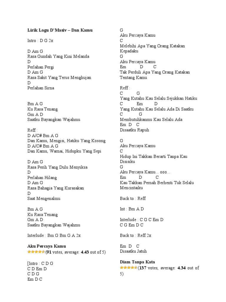 Dm kau membuat….ku tak berdaya…. Saat ini kami memiliki lebih dari puluhan ribu database chord, tabs. C cmaj7 f c cmaj7 f saat aku tertawa di atas semua c cmaj7 f saat aku menangisi kesedihanku am g f aku ingin engkau selalu ada am g f g aku ingin engkau aku kenang f em selama aku masih bisa bernafas. C dm f am g c nyamannya bahagianya f am g. Nice dhe buat you d'masiv!!!!!